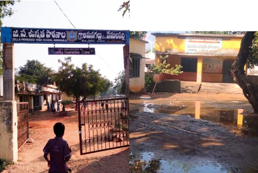 వేములపల్లి మండలం ఆమనగల్లు ప్రైమరీ, హై స్కూల్ ప్రభుత్వ పాఠశాలలో చినుకు పడితే చిత్తడే.తెలంగాణ రాష్ట్రమంతా ప్రభుత్వ పాఠశాలలో కార్పొరేట్ పాఠశాలలకు దీటుగా.. అభివృద్ధి చెందుతున్నాయి.ఆమనగల్లు పాఠశాలలు మాత్రం ఎక్కడ వేసిన గొంగడి అక్కడే అనే విధంగా ఉంది.అభివృద్ధిలో వెనుకంజలో పాఠశాల.. వర్షం పడితే పాఠశాల చెరువును తలపిస్తూ..విద్యార్థులకు ఇబ్బందికరంగా మారింది.ఉపాధ్యాయులు విద్యార్థులకు పాఠశాలలోనే ప్రత్యేక శిక్షణ అందించడంతో విద్యార్థుల భవితకు బంగారు భవిష్యత్తు కు పునాదులు పాఠశాలలు.నేడు ఆ పాఠశాలకు ప్రభుత్వం కేటాయించే ప్రత్యేక నిధులు ఏమైనాయి…? మండల విద్యాశాఖ అధికారి ఇటీవల కాలంలో అనేకసార్లు పాఠశాలను విజిట్ చేశారు కాని సమస్యలు కనిపించడం లేదు.గత సంవత్సరం నుండి ఉపాధ్యాయులు విద్యాశాఖ అధికారికి,రాజకీయ నాయకులకు అనేకసార్లు..పాఠశాల గోడును.. వినిపించిన సంవత్సరాలు గడుస్తున్నా..ఫలితం శూన్యంగా మారింది.ఇకనైనా ప్రజాప్రతినిధులు అధికారులు స్పందించి పాఠశాల అభివృద్ధికి సహకరించాలని విద్యార్థుల తల్లి దండ్రులు కోరుతున్నారు.