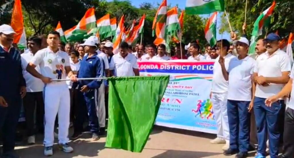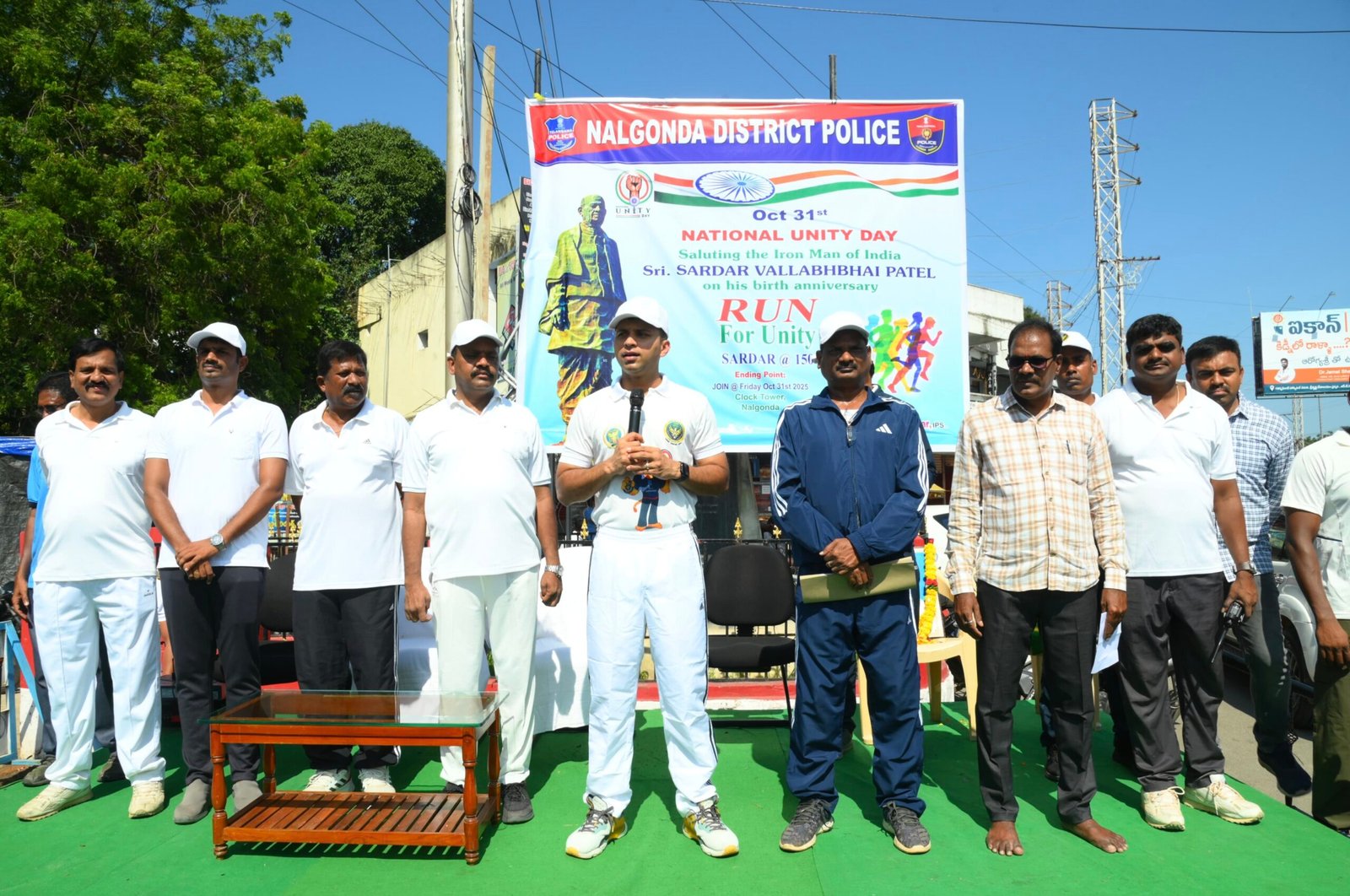 జాతీయ ఐక్యత దినోత్సవం ఉక్కు మనిషి సర్దార్ వల్లభాయి పటేల్ 150 వ జయంతి సందర్భంగా పోలీస్ శాఖ ఆధ్వర్యంలో రన్ పర్ యూనిటీ కార్యక్రమంలో బాగంగా 2కె రన్ కార్యక్రమం పట్టణ కేంద్రంలోని యన్.జి కళాశాల నుంచి క్లాక్ టవర్ వరకు నిర్వహించడం జరిగింది. ఈ కార్యక్రమాన్ని జిల్లా ఎస్పీ శరత్ చంద్ర పవార్ ఐపీఎస్ జెండా ఊపి ప్రారంభించి, పోలీస్ అధికారులు, సిబ్బంది,స్థానిక యువత, విద్యార్ధిని విద్యార్థులు,ఇతర అధికారులు దాదాపు 500 మందితో కలిసి దేశ సమైక్యతను పత్రిబంబించేలా ఉత్సాహంగా ఈ పరుగులో పాల్గొన్నారు.ఈ సందర్భంగా జిల్లా ఎస్పీ సర్దార్ పటేల్ చిత్ర పటానికి పూల మాల వేసి ఘనంగా నివాళులు అర్పించి మాట్లాడుతూ భారత దేశ స్వాతంత్ర పోరాటంలో కీలక పాత్ర పోషించి, 550 కి పైగా సంస్థానాలను భారత దేశంలో విలీనం చేయుటకు దృడ సంకల్పంతో ఏలాంటి వత్తిడికి లొంగకుండా కీలక పాత్ర పోషించిన గొప్ప వ్యక్తి సర్దార్ వల్లభాయి పటేల్ అన్నారు. అతని150 వ జయంతి సందర్భంగా మనందరం ఆయన ఆశయాలను గుర్తు చేసుకుంటూ దేశ సమగ్రత, ఐక్యత దేశ భక్తితో కలిసి ఉంటూ దేశాన్ని ముందుకు తీసుకెళ్లాలని అన్నారు.అనంతరం జాతీయ ఐక్యత దినోత్సవ ప్రతిజ్ఞ చేయడం జరిగింది.ఈ కార్యక్రమంలో అడిషనల్ ఎస్పీ రమేష్,నల్లగొండ డిఎస్పి శివరాంరెడ్డి, ఏఆర్ డిఎస్పి శ్రీనివాసులు, సిఐలు రాజశేఖర్ రెడ్డి,మహా లక్ష్మయ్య, జితేందర్ రెడ్డి, శ్రీను నాయక్,రఘువీర్ రెడ్డి ఆర్ ఐ లు సంతోష్, శ్రీను,సూరప్ప నాయుడు, హరిబాబు ఎస్సైలు సైదులు, గోపాల్ రావు,పోలీస్ సిబ్బంది తదితరులు పాల్గొన్నారు.